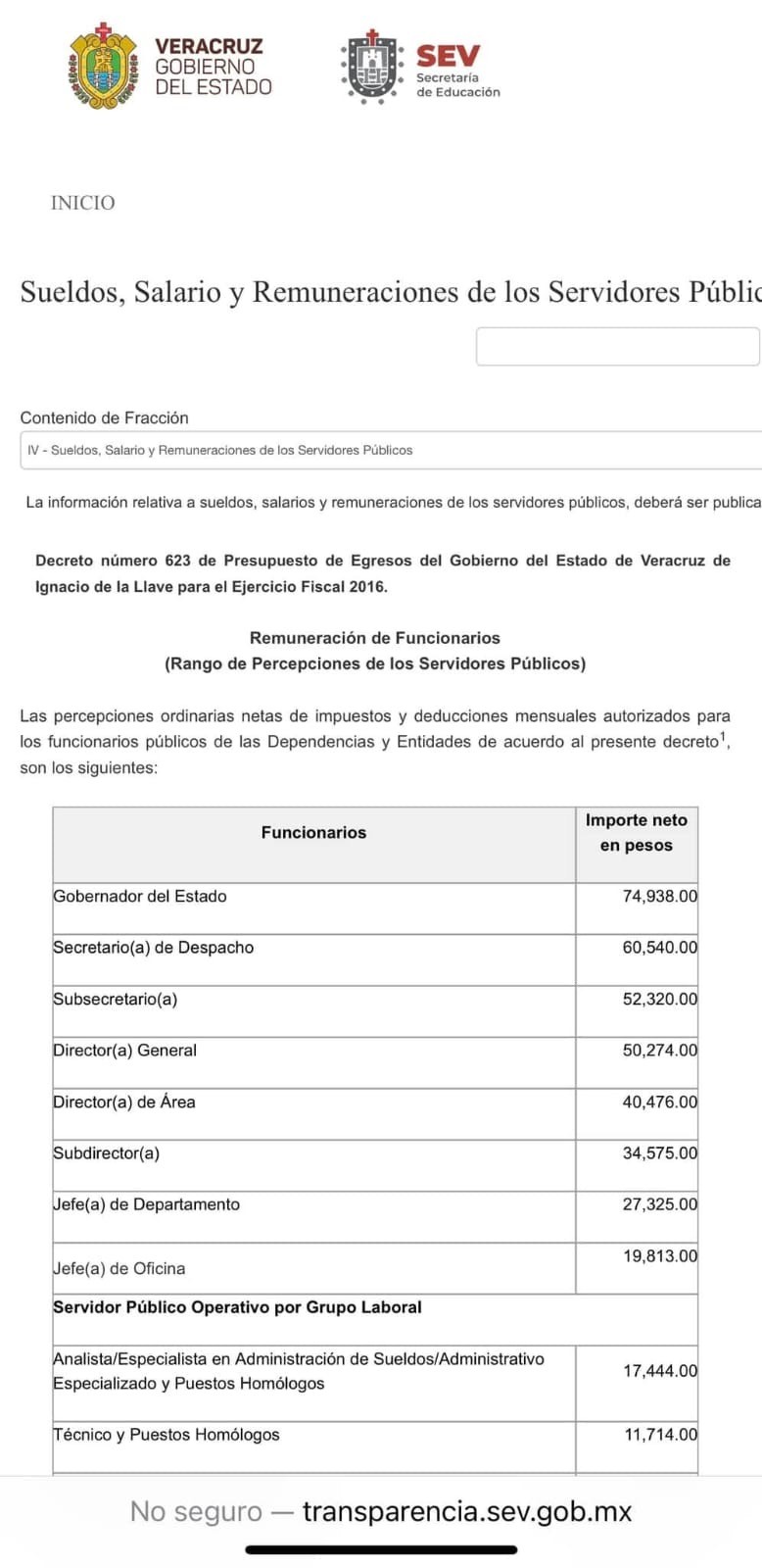 El mensaje fue acompañado de una tabla donde se muestra que, durante la administración de Javier Duarte de Ochoa, el salario del gobernador era de 74 mil 938 pesos mensuales.