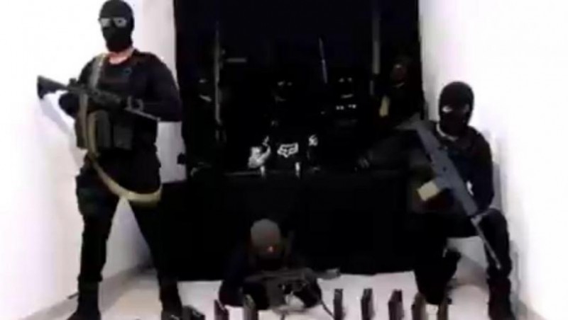 En la grabación, de 03:22 minutos, se puede ver a ocho sujetos encapuchados, vestidos de negro y portando armas largas, además de equipo táctico.