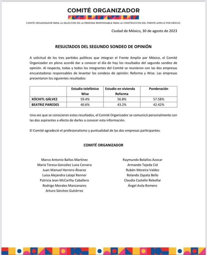 Finalmente, en cuanto a ponderación, el Comité del FAM indicó que Xóchitl Gálvez tiene 57.58 por ciento de preferencia por 42.42 por ciento de Beatriz Paredes.