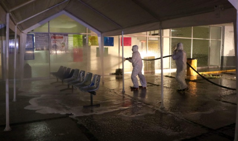 Personal del gobierno municipal desde las 20:00 horas, comenzó estos trabajos con la aspersión del liquido alrededor del hospital y de sus principales accesos, puntos de reunion diaria de pacientes y acompañantes y que los convierte en el sitio de contacto de mayor cantidad de personas que acuden centro hospitalario.