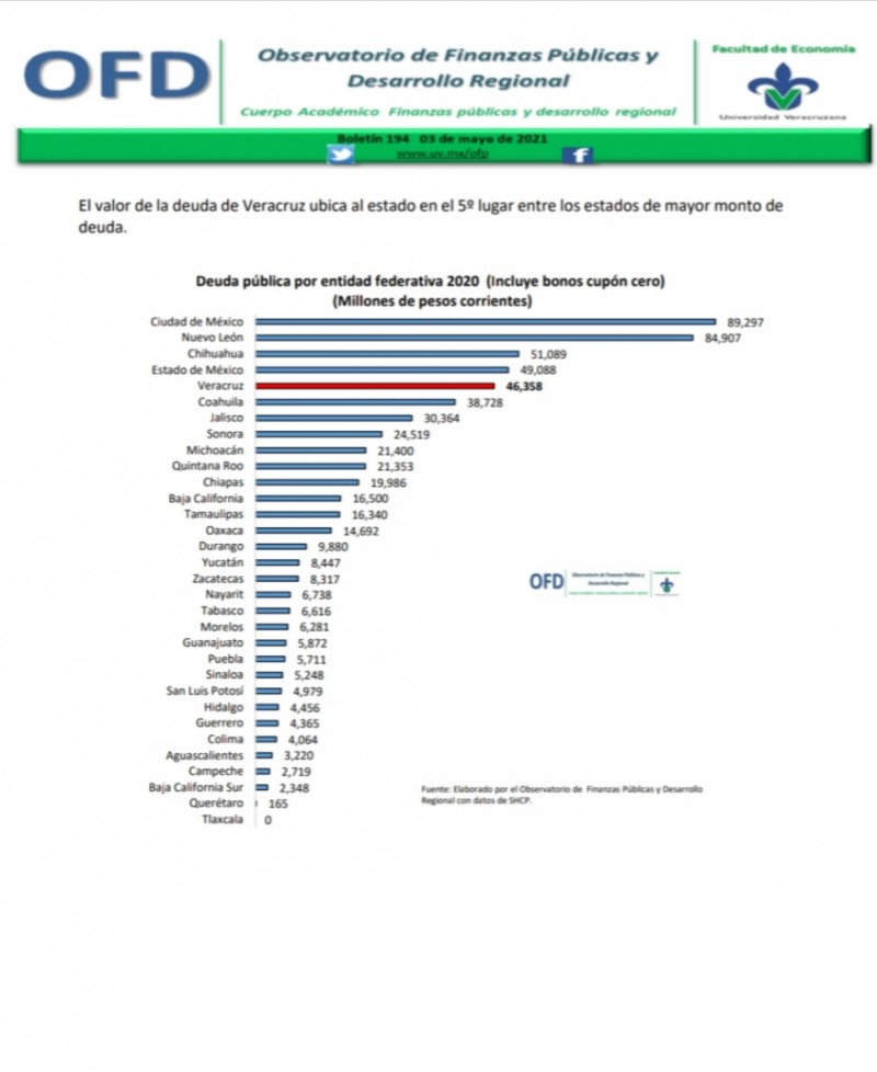 El valor de la deuda de Veracruz ubica al estado en el quinto lugar a nivel nacional entre los estados de mayor monto de deuda. El primer lugar es ocupado por la Ciudad de México, posteriormente está Nuevo León, Chihuahua, Estado de México y Veracruz.