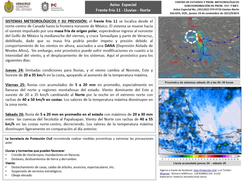 El frente frío 11 se localiza desde el norte-centro de Canadá hasta la frontera noroeste de México. El sistema se mueve hacia el sureste impulsado por una masa fría de origen polar, esperándose ingrese al noroeste del Golfo de México la medianoche del viernes, y cruce Tamaulipas y parte de Veracruz, debilitado, dado que su masa fría podría perder ímpetu y presión debido al comportamiento de los vientos en altura, asociados a una DANA (Depresión Aislada de Niveles Altos).