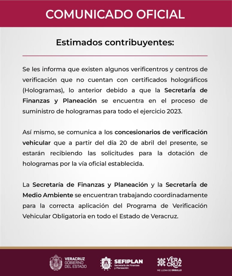 “Se les informa que existen algunos verificentros y centros de verificación que no cuentan con certificados holográficos (Hologramas), lo anterior debido a que la Secretaria de Finanzas y Planeación se encuentra en proceso de suministro de hologramas para todo el ejercicio 2023”.
