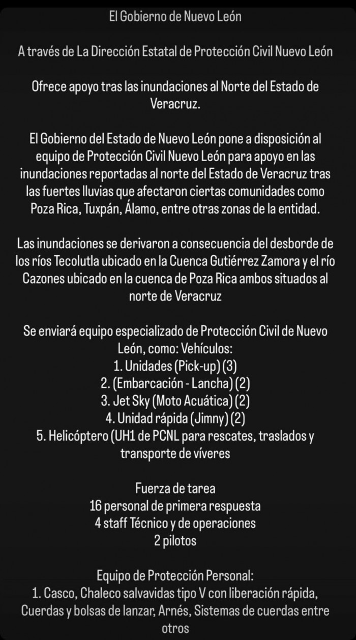 ►2025-10-10 - El gobernador Samuel García informó a través de sus redes sociales que ha instruido a Protección Civil estatal para brindar asistencia directa en la región.
